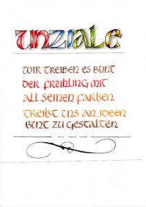 Wir treiben es BUNT in den Frühling mit der vielseitigen Schrift, der Unziale. Diese ist eine Schriftart aus dem Mittelalter. Jeder Kursabend fordert unsere Fantasie aufs Neue. Wir arbeiten mit vielen verschiedenen Materialien und Farben.